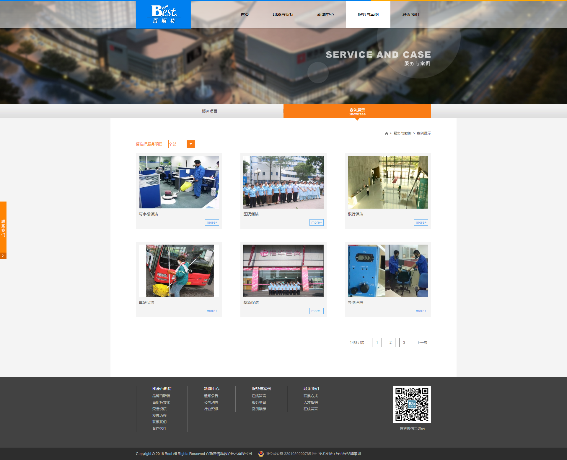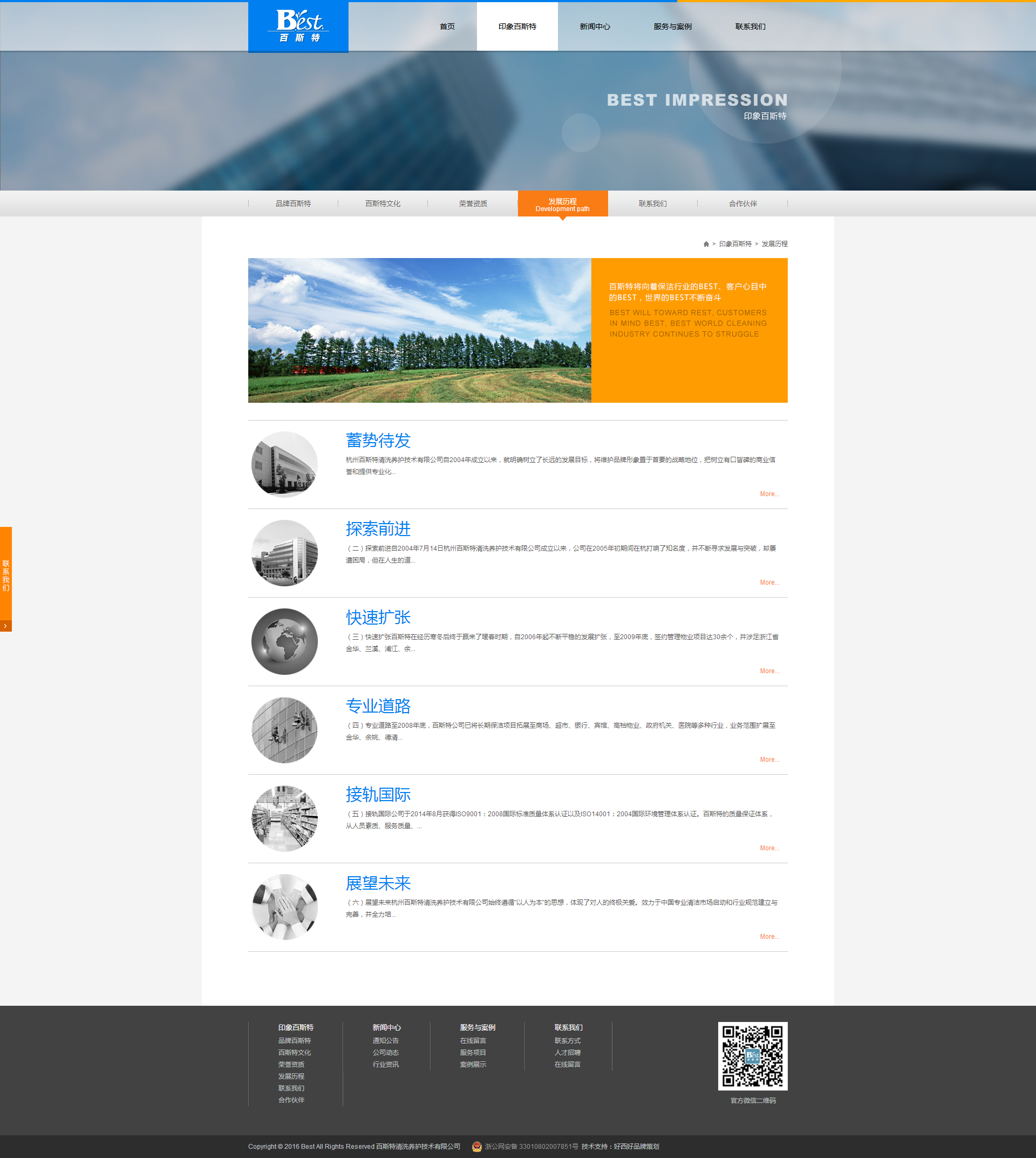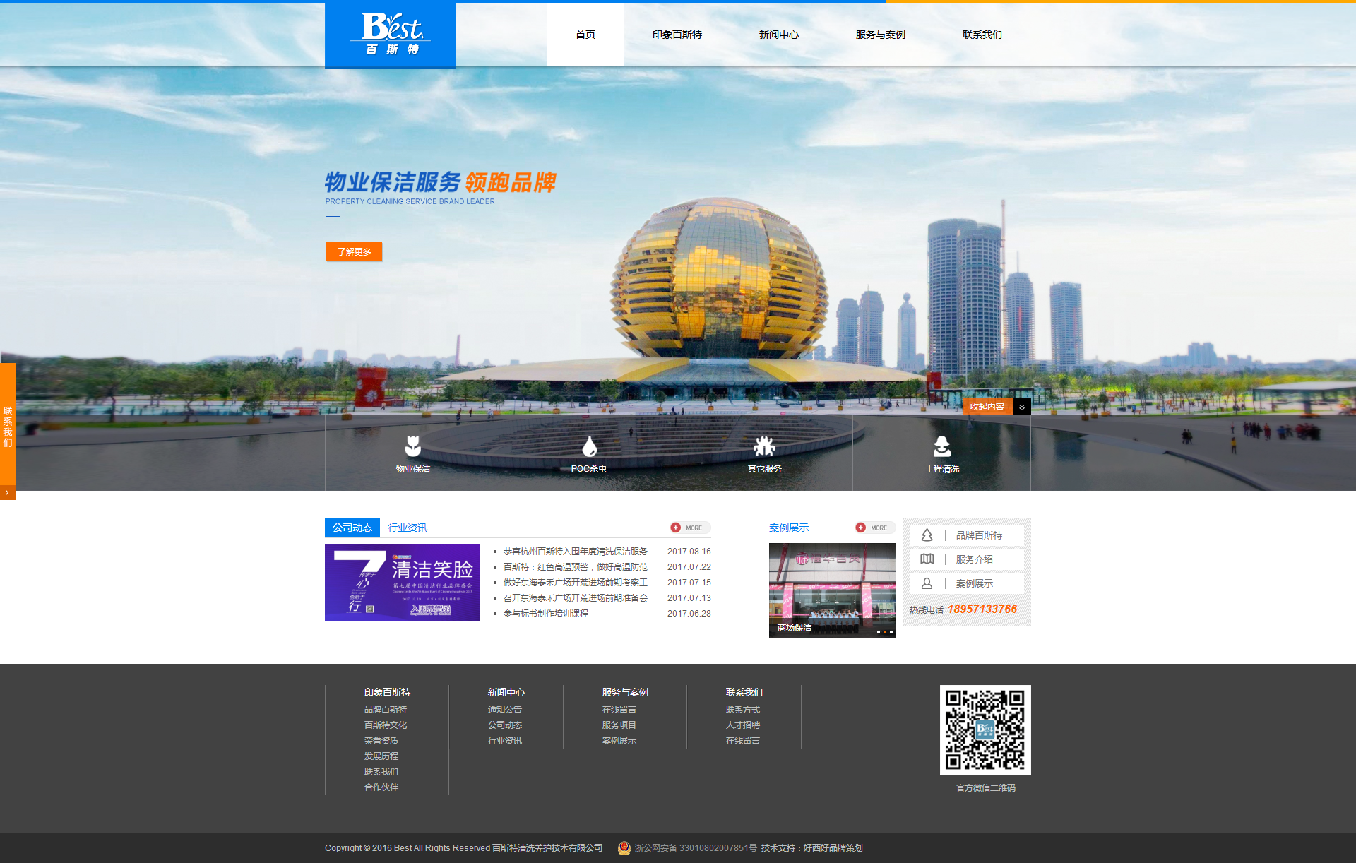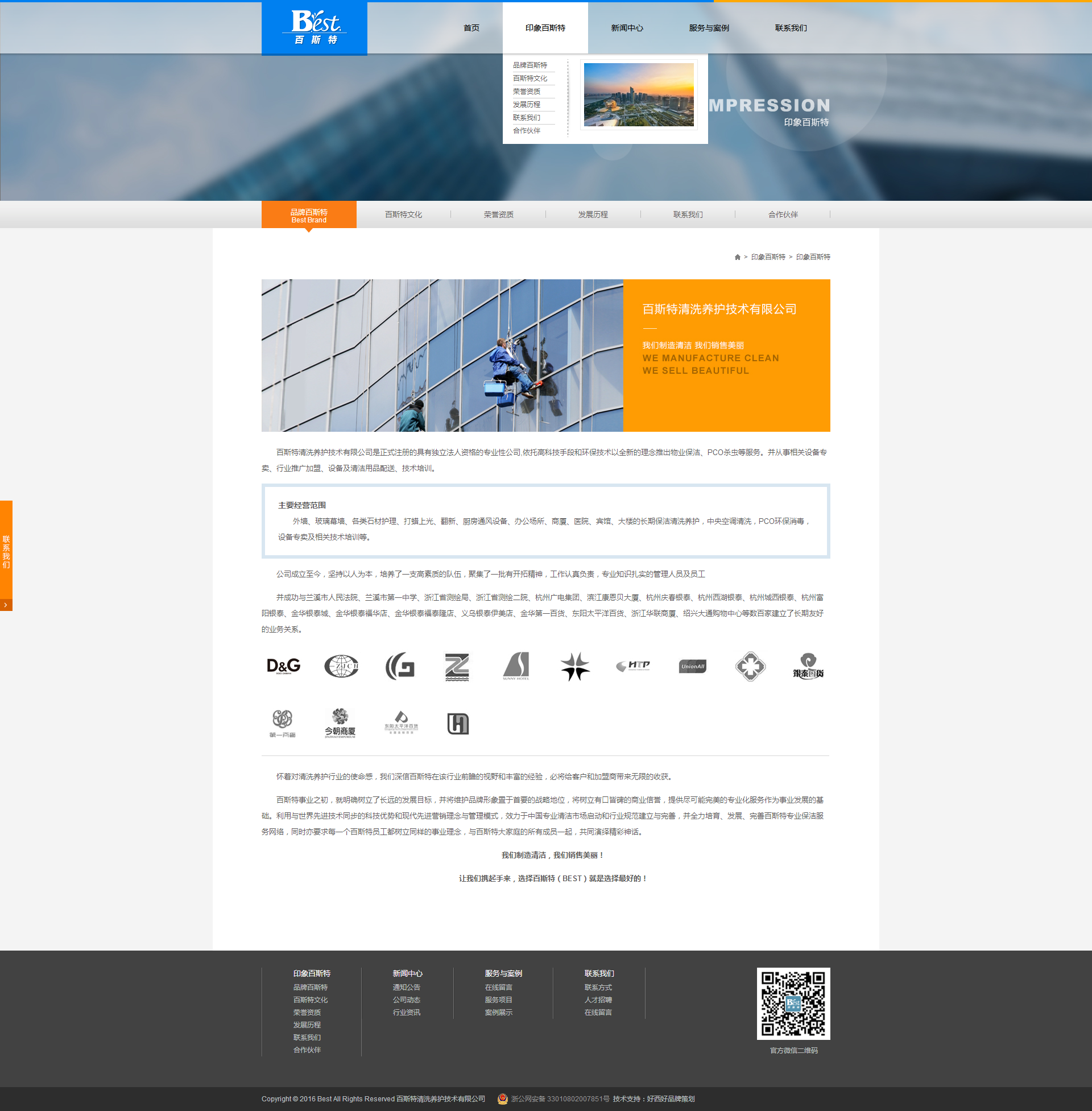 百斯特清洗養(yǎng)護(hù)技術(shù)有限公司是正式注冊的具有獨(dú)立法人資格的專業(yè)性公司,依托高科技手段和環(huán)保技術(shù)以全新的理念推出物業(yè)保潔、PCO殺蟲等服務(wù)。并從事相關(guān)設(shè)備專賣、行業(yè)推廣加盟、設(shè)備及清潔用品配送、技術(shù)培訓(xùn)。 主要經(jīng)營范圍 外墻、玻璃幕墻、各類石材護(hù)理、打蠟上光、翻新、廚房通風(fēng)設(shè)備、辦公場所、商廈、醫(yī)院、賓館、大樓的長期保潔清洗養(yǎng)護(hù),中央空調(diào)清洗,PCO環(huán)保消毒,設(shè)備專賣及相關(guān)技術(shù)培訓(xùn)等。 公司成立至今,堅持以人為本,培養(yǎng)了一支高素質(zhì)的隊伍,聚集了一批有開拓精神,工作認(rèn)真負(fù)責(zé),專業(yè)知識扎實的管理人員及員工并成功與蘭溪市人民法院、蘭溪市第一中學(xué)、浙江省測繪局、浙江省測繪二院、杭州廣電集團(tuán)、濱江康恩貝大廈、杭州慶春銀泰、杭州西湖銀泰、杭州城西銀泰、杭州富陽銀泰、金華銀泰城、金華銀泰福華店、金華銀泰福泰隆店、義烏銀泰伊美店、金華第一百貨、東陽太平洋百貨、浙江華聯(lián)商廈、紹興大通購物中心等數(shù)百家建立了長期友好的業(yè)務(wù)關(guān)系。
